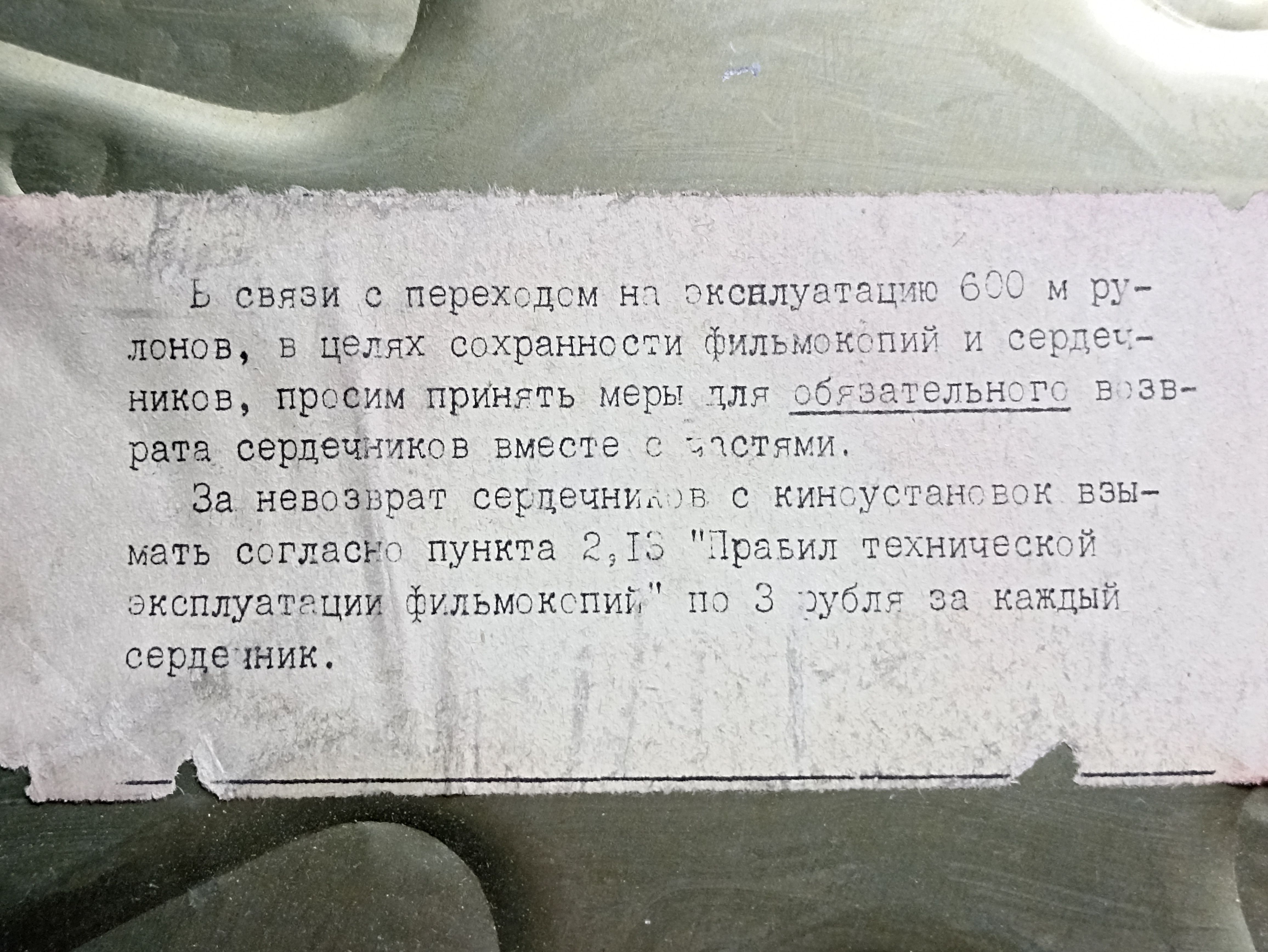 Переход на 600 метровые рулоны нужно было начинать с производителей киноплёнки и кинокопировальных фабрик, тогда бы не нужно было закупать 600 метровую тару и выбрасывать 300 метровую. В Камне-на- Оби был завод (как назывался не помню), там штамповали 600 метровые частевые коробки, на дне вроде бы надпись АКМЗ или что-то похожее. Наш прокат на 600 метров переводил фильмы в основном которые лежали на полке, которым не нужны были фильмоноски, типа "Война и мир".