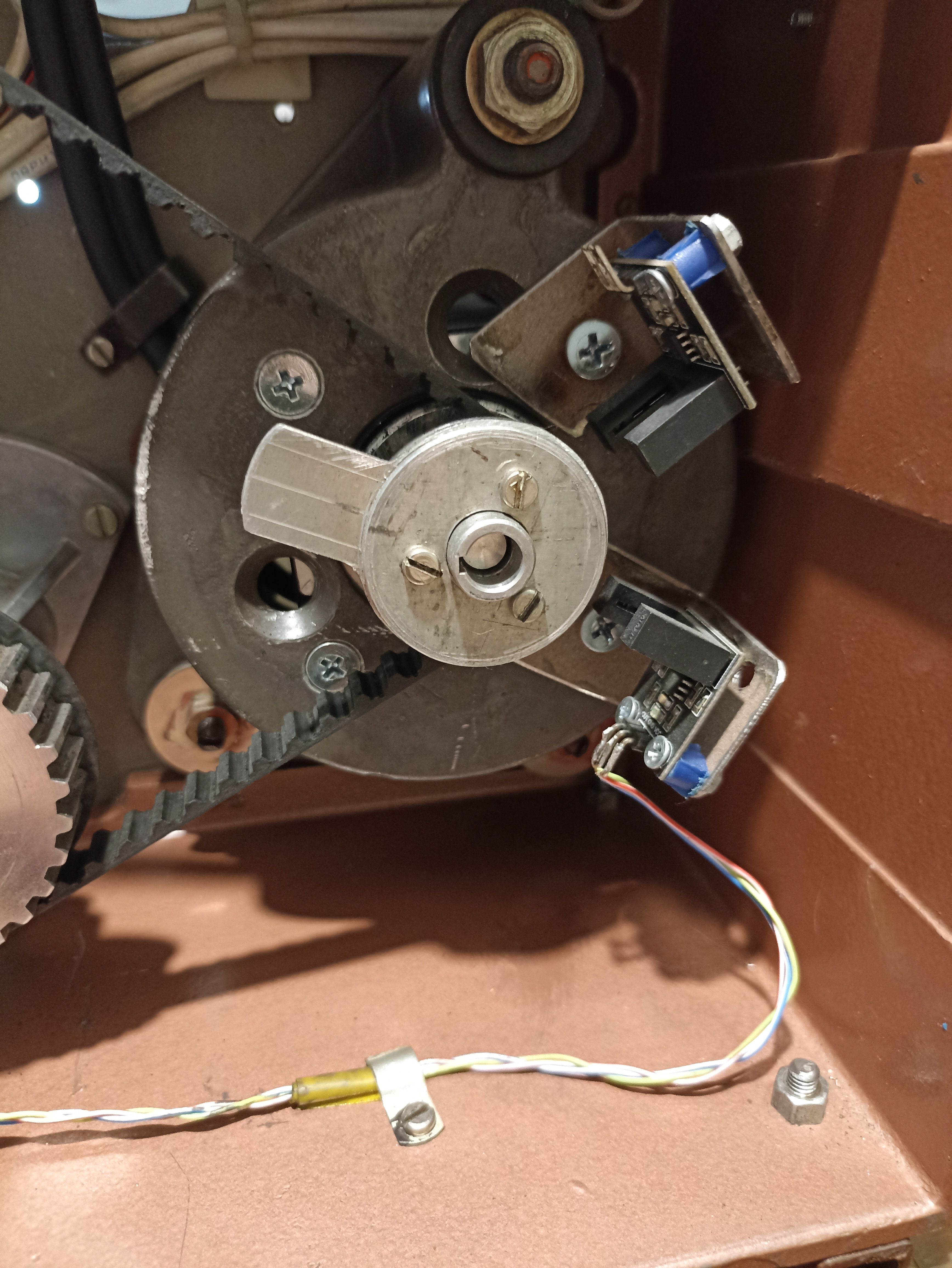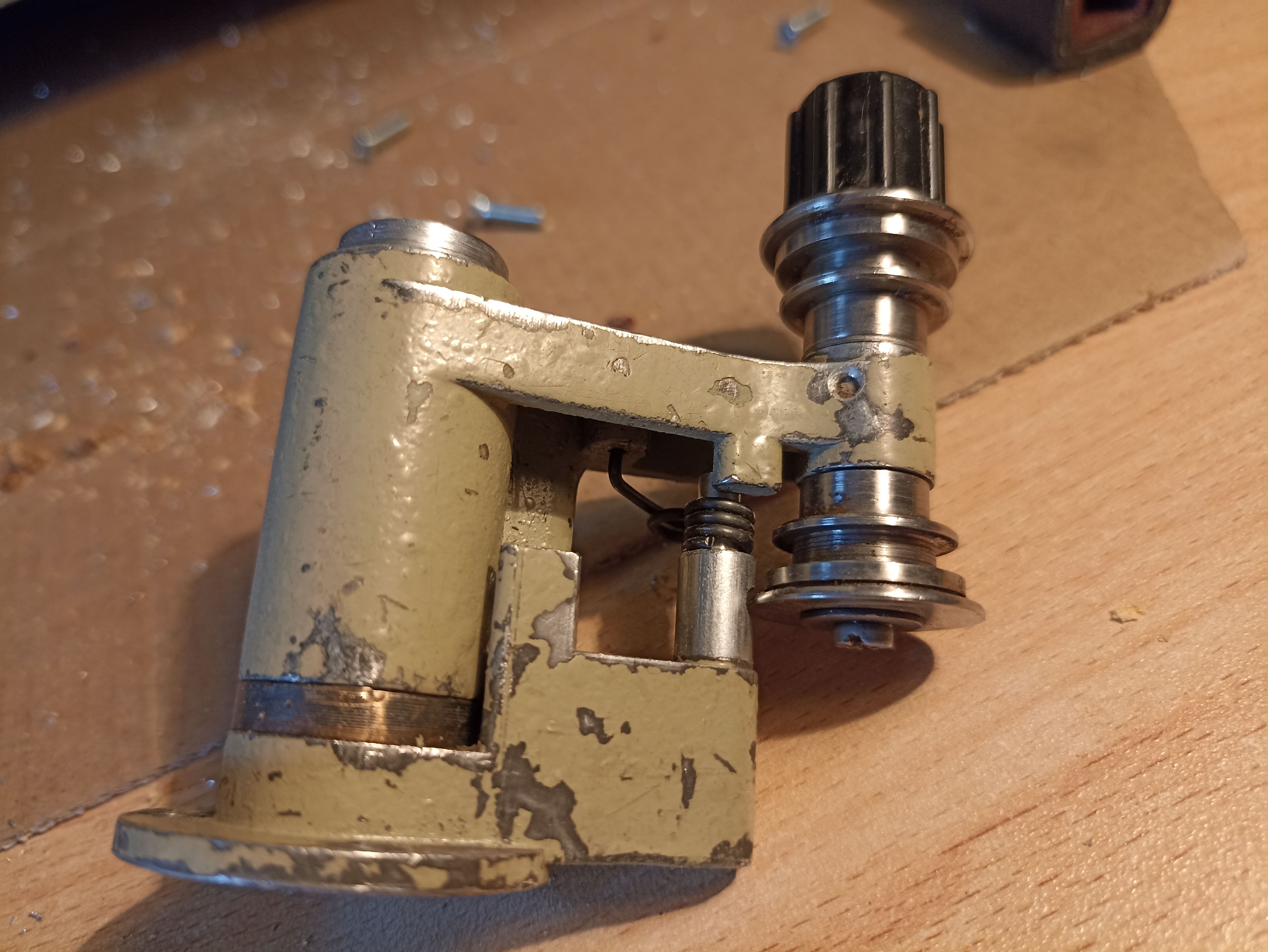 Подвергся мой аппарат очередной модернизации, решил побороться с поперечной неустойчивостью кадра в фильмовом канале. Установил прижимной ролик скачкового барабана от 23КПК предварительно модернизировав его, установил на него ролики с буртиком, теперь надеюсь буртики будут сдерживать киноплёнку от поперечного "гуляния", киноплёнка в фильмовом канале будет удерживаться двумя роликами, поперечно-направляющим и прижимным. Запустил сейчас часть на сканирование, посмотрим что получиться.
