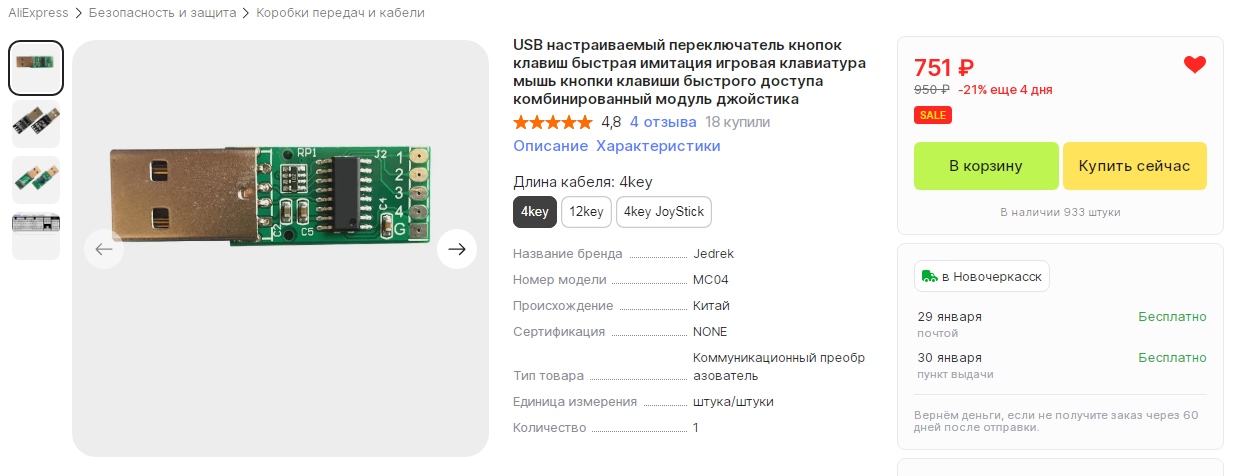 на алиэкспресс был куплен вот такой имитатор клавиатуры на четыре кнопки.