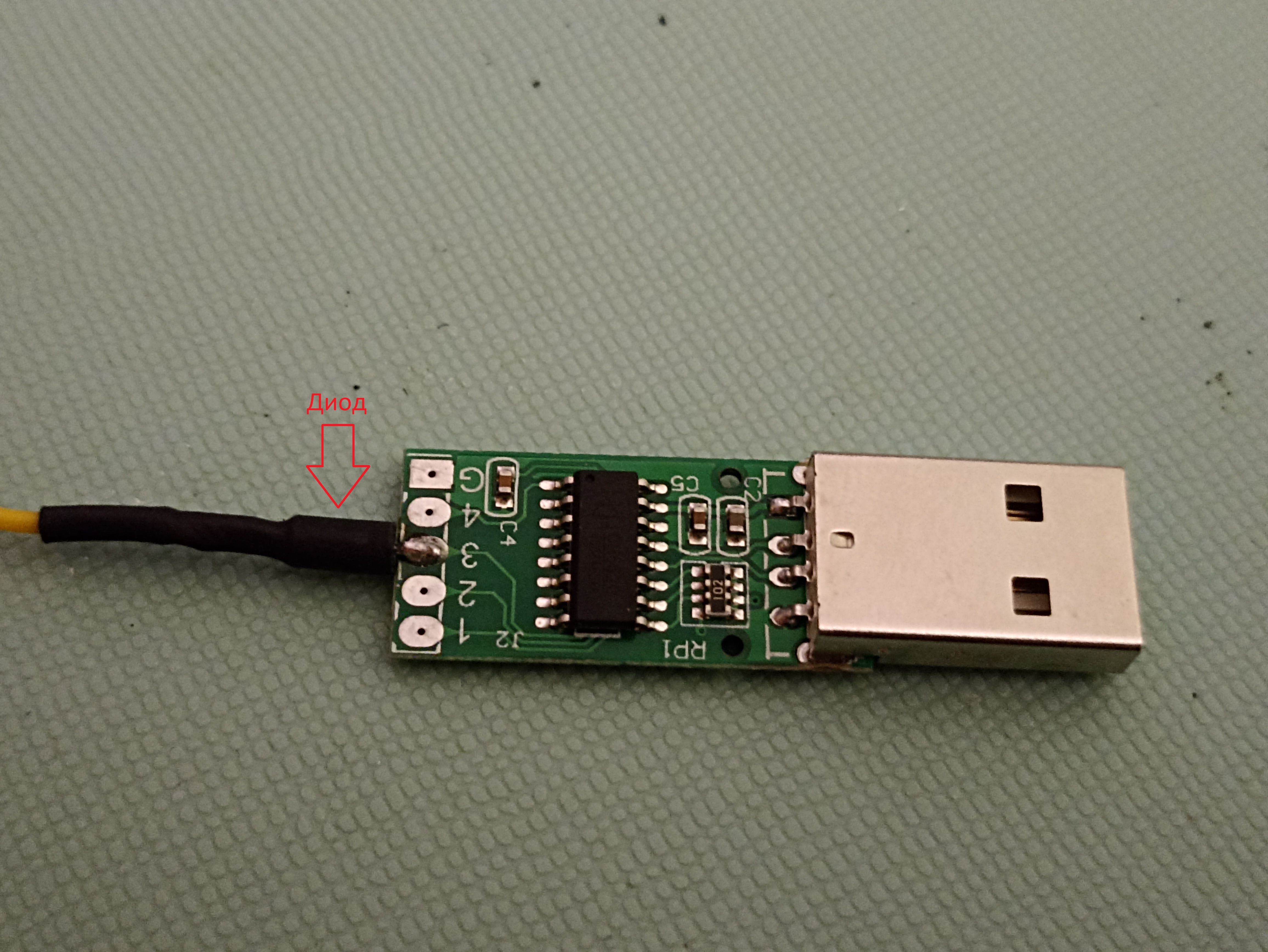 Чтобы на плату имитатора клавиатуры не подавалось сигнальное напряжение +5 вольт с оптопары, в цепь сигнального провода был установлен диод, на фото диод находится в термотрубке, забыл сфотать.