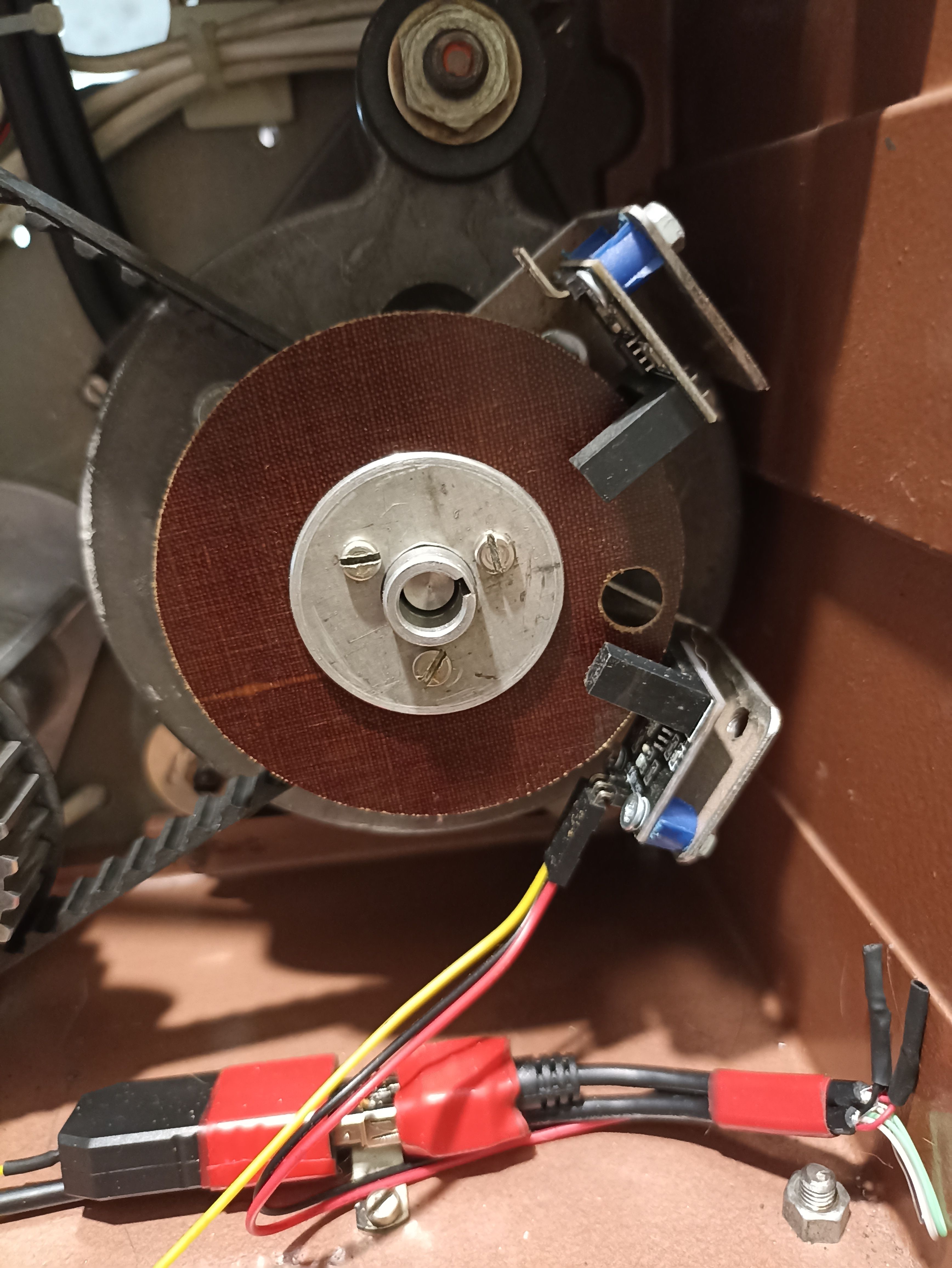 При тщательном изучении выяснилось, что если свет не перекрыт, то на сигнальном контакте платы присутствует напряжение -5 вольт. Получается, что если свет не перекрыт, то на контакте -5 вольт, а если перекрыт, то +5 вольт, немного подумав я решил изготовить новую заслонку (шторку) на оптопару, теперь свет перекрыт постоянно и в нужный момент кратковременно подаётся, заслонка (шторка) получилась в виде диска с небольшим отверстием, тем самым я получил сигнал -5 вольт в нужный мне момент.